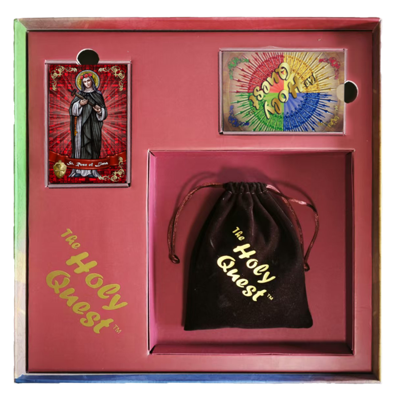 The box insert for The Holy Quest is a custom-designed component crafted from a color-printed and laminated corrugated cardboard. Sized to fit perfectly within the 12"x12" box, its reddish-brown color is a precise match for the leather-like backing of the game board, providing a beautiful and cohesive look. The insert is enhanced with a striking gold foil game logo stamped on its surface, adding to the premium feel and attention to detail.